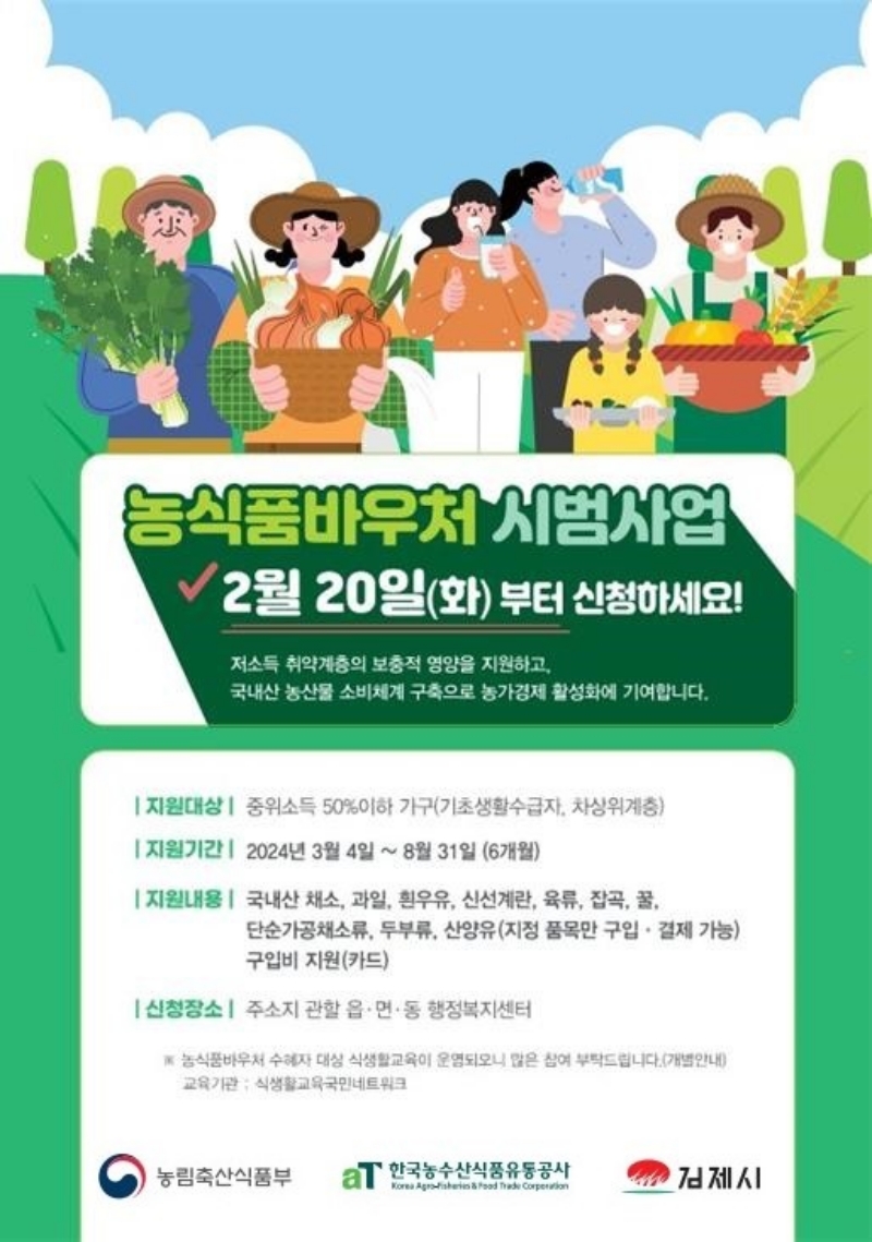 [김제=뉴전북] 김제시는 20일부터 도내 유일 4년 연속 추진하고 있는 2024년 농식품바우처 시범사업 접수를 시작한다고 밝혔다.