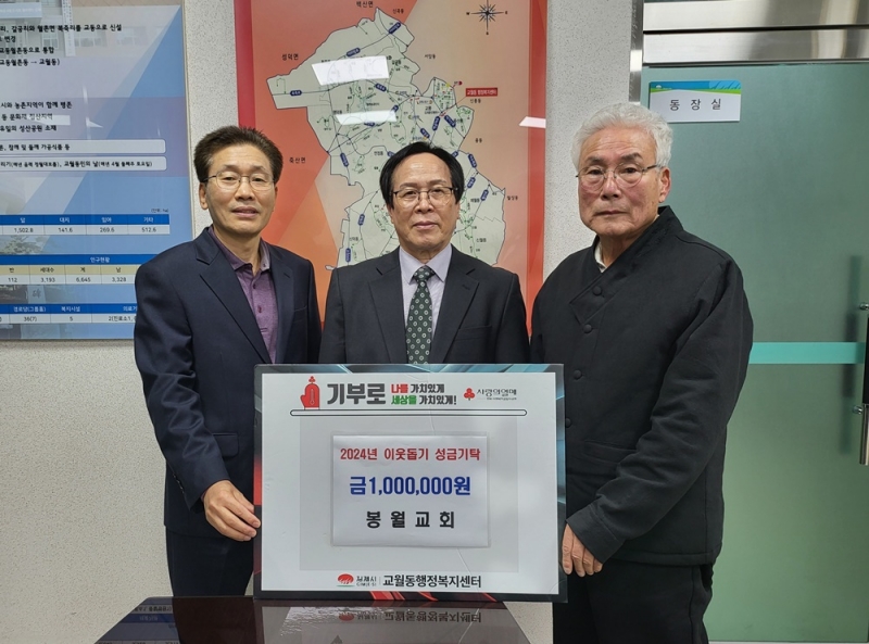 [김제=뉴전북] 김제시 교월동 행정복지센터는 지난 19일 월봉동에 있는 봉월교회(담임목사 박기술)가 지역의 어려운 이웃을 위해 사용해 달라며 성금 100만 원을 기탁했다고 밝혔다.