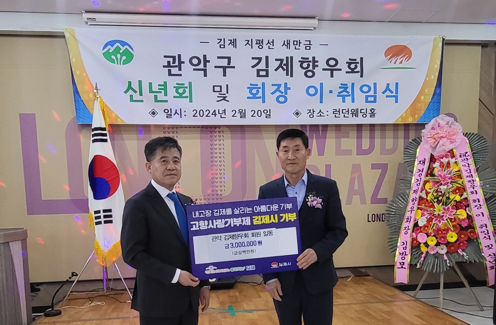 김제시(시장 정성주)는 지난 20일 관악김제향우회가 회장 이ㆍ취임식 및 신년회 행사에서 정진근 신임 회장을 비롯해 회원들이 중심이 되어 고향사랑기부금 3백만 원을 기탁했다고 밝혔다.