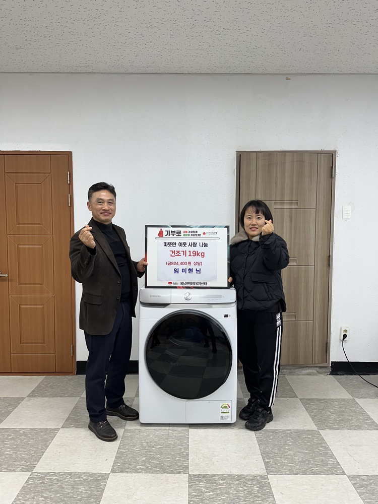 [김제=뉴전북] 김제시 봉남면 행정복지센터는 지난 20일 자활근로사업 참여자 임미현씨가 실버빨래방에 건조기 19kg(금824,400원 상당)을 기부했다.