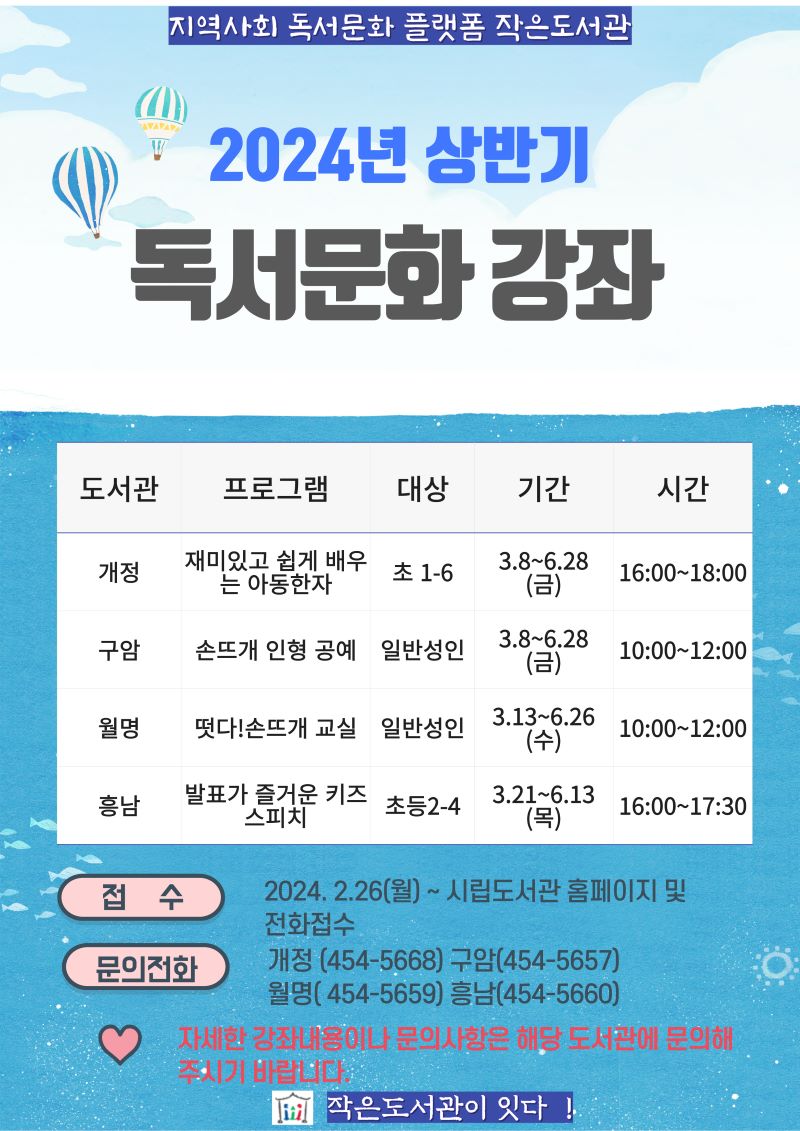 참여를 원한다면 2월 26일부터 전화접수 및 홈페이지로 신청가능하며 선착순으로 인원이 마감된다. 자세한 강좌 내용이 궁금하거나 문의사항이 있다면, 홈페이지 공지사항을 확인 하거나 해당 작은 도서관에 문의하면 된다.