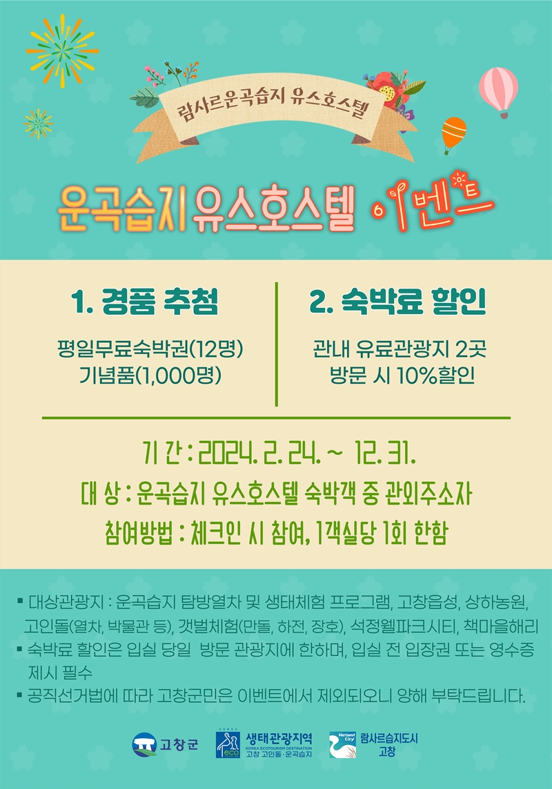 경품추첨 이벤트는 람사르 운곡습지 유스호스텔 숙박객 중 관외주소자를 대상으로, 1객실당 1회씩 뽑기를 통해 경품을 제공하는 행사다. 경품 참여자에게는 평일 무료숙박권(12명) 및 기념품(1000명)이 선물로 제공된다.