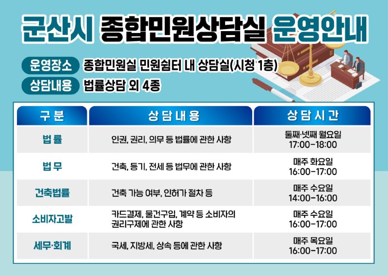 상담은 군산시청 종합민원실 민원 쉼터 내에서 운영하고 있으며 매월 둘째, 넷째 주 월요일 오후 5~6시에는 법률상담 매주 화요일은 법무상담 소비자고발 상담은 매주 수요일, 세무·회계 상담은 매주 목요일 각각 오후 4~5시에 진행된다.건축법률 상담의 경우 매주 수요일 오후 2~4시에 진행한다.