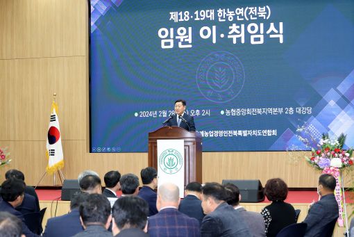 [도정=뉴전북] 사)한국후계농업경영인 전북특별자치도연합회는 28일 농협중앙회전북본부 대강당에서 제18·19대 회장단 이·취임식을 개최했다.