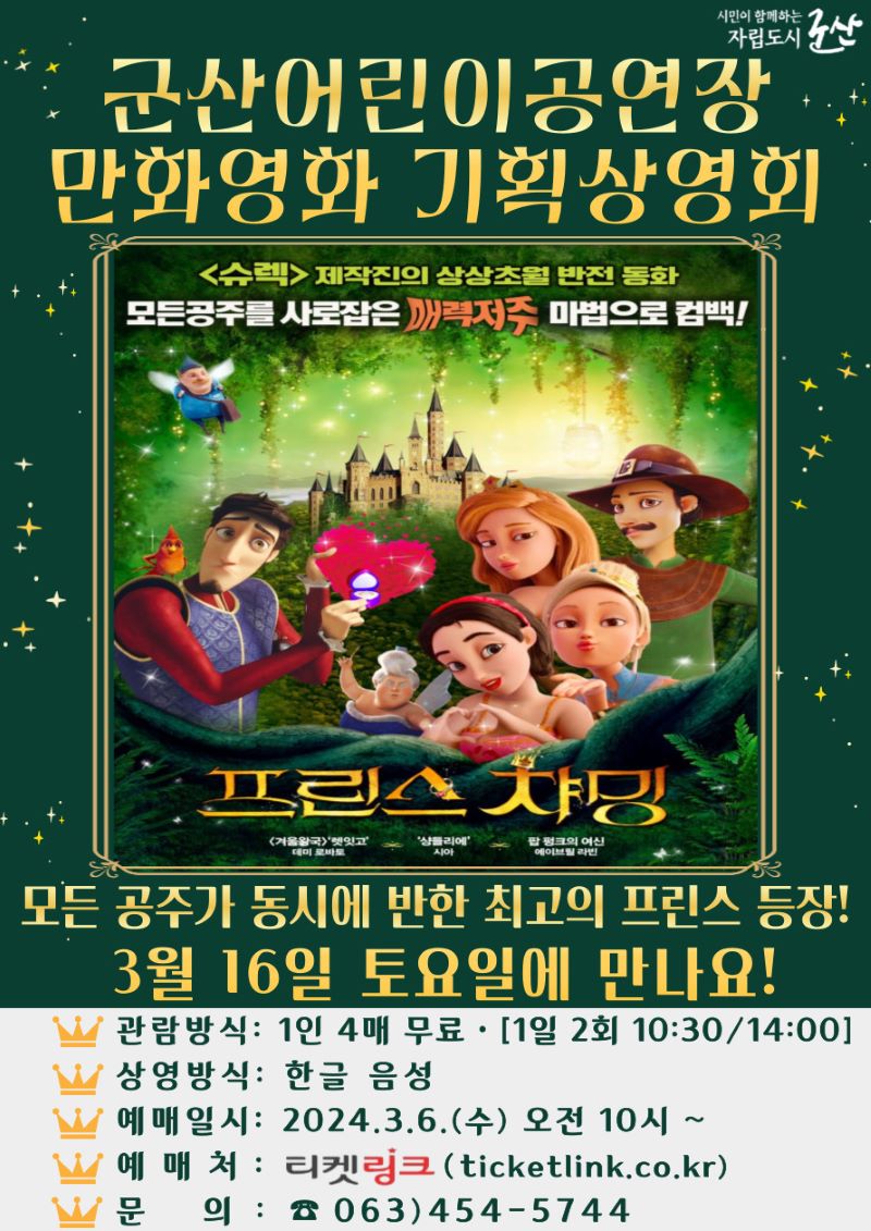 [군산=뉴전북] 군산어린이공연장에서는 어린이 만화영화 `프린스 챠밍` 을 3월 16일(토) 10시 30분과 14시에 상영한다고 밝혔다.