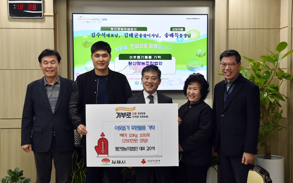 정성주 김제시장은 “영양가득 백미를 기부해 주신 황산영농조합법인에 감사드리고 기부해 주신 백미는 법인의 따뜻한 마음을 담아 지역사회의 어려운 이웃들에게 잘 전달하겠다”며 감사를 표했다.