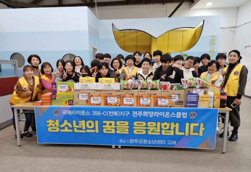 [완주=뉴전북] 전주희망라이온스클럽(회장 임영례)이 청소년들의 새학년을 축하하고, 청소년들의 꿈을 응원하는 마음을 담아 완주군 고산면에 위치한 완주군청소년센터 고래에 간식을 후원했다.