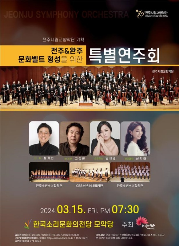 전주시는 오는 15일 오후 7시 30분, 한국소리문화의전당 모악당에서 전주시립교향악단의 ‘전주·완주 문화벨트 형성을 위한 특별연주회’가 열린다고 8일 밝혔다.
