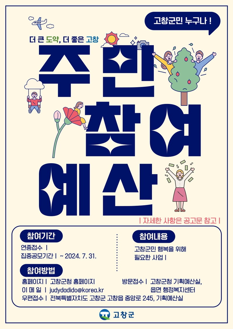 [고창=뉴전북] 고창군이 내년(2025년도) 예산편성을 위한 주민제안사업을 오는 7월 31일까지 공모한다고 11일 밝혔다.