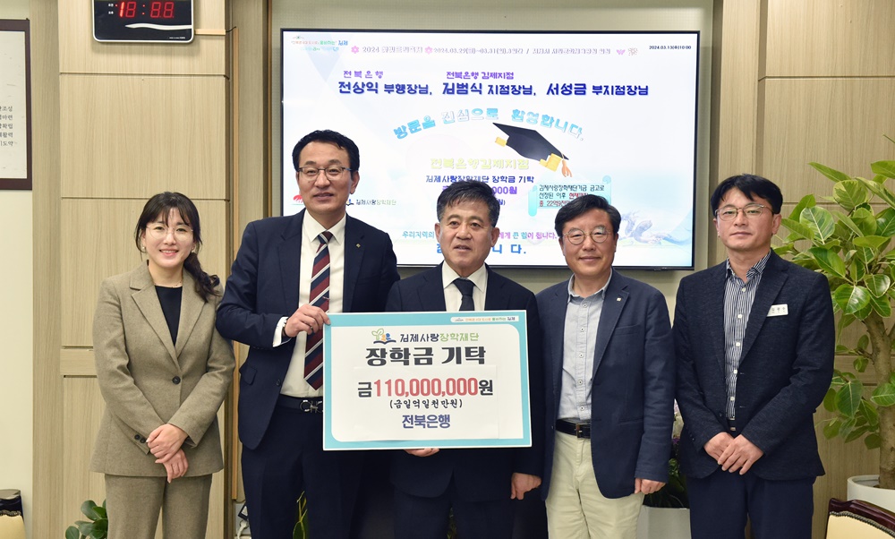 [경제=뉴전북] 김제사랑장학재단(이사장 정성주)은 13일 전북은행(은행장 백종일)이 지역 인재 양성과 학생들의 학업 전념을 위해 장학금 1억 1천만 원을 기탁 했다고 밝혔다.