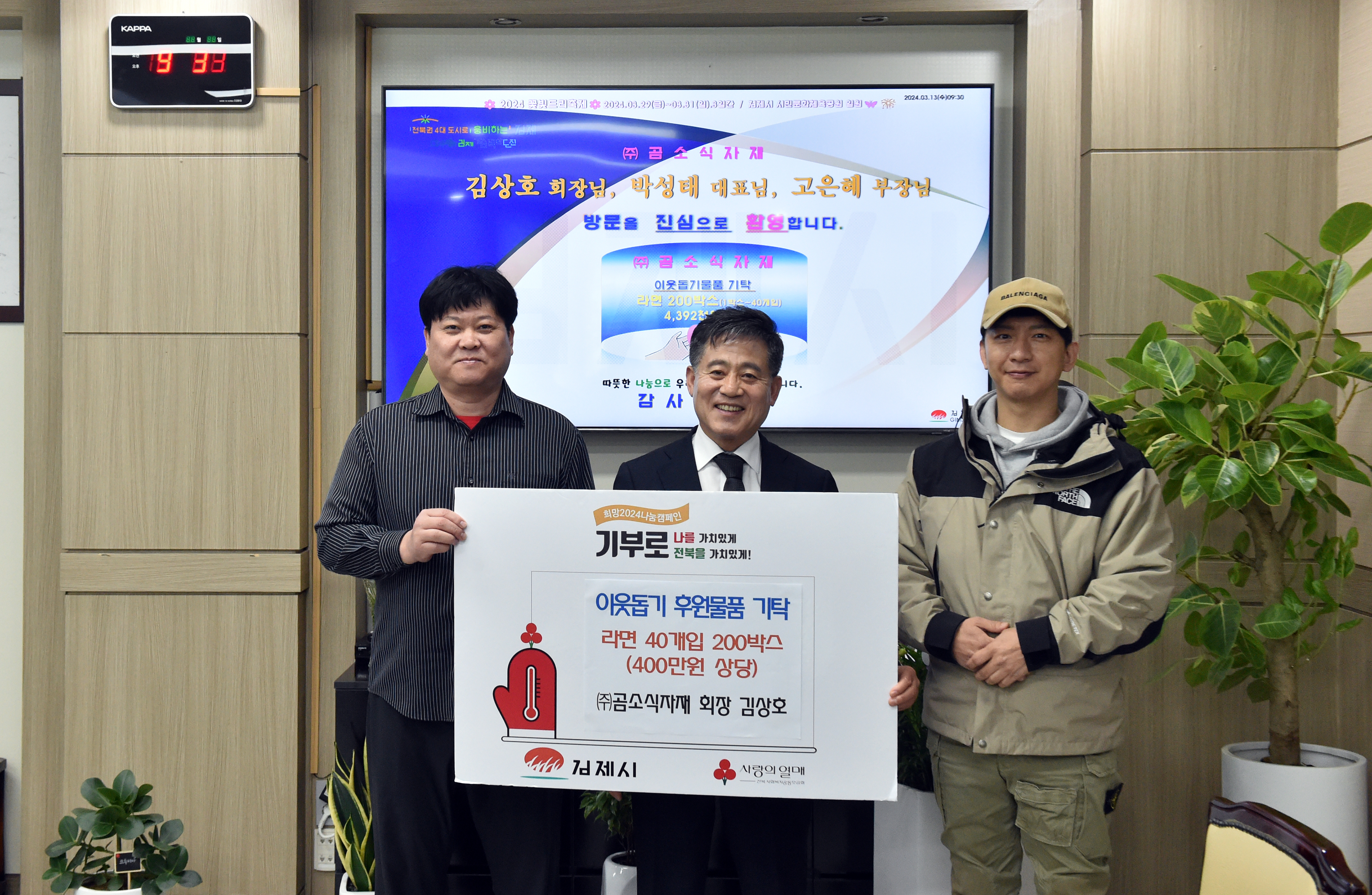 [김제=뉴전북] 김제시(시장 정성주)는 ㈜곰소식자재(회장 김상호)가 13일 관내 저소득 취약계층 및 사회복지시설에 지원해 달라며 라면 40개입 200box(440만원 상당)를 기탁했다고 전했다.