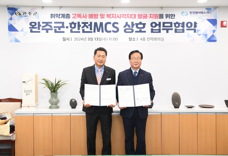 13일 완주군(군수 유희태)과 한전MCS(주) 전북지사(지사장 김성호)는 업무협약을 체결하고, 취약계층 고독사 예방과 복지사각지대 발굴을 위해 힘을 모으기로 했다.