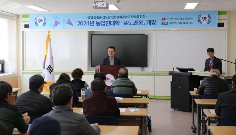 전주시 농업기술센터(소장 김종성)는 14일 교육생 35명이 참석한 가운데 ‘제20기 전주시 농업인대학’ 포도과정 교육의 개강식을 가졌다.