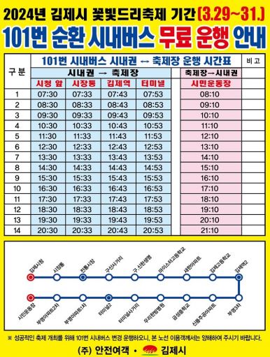 101번 버스의 간소화(변경) 노선은 시청 앞을 시작으로 전통시장 ~ 구산사거리 ~ 김제역 ~ 터미널 ~ 검산초등학교 ~ 축제장(시민운동장)순으로 운행한다.