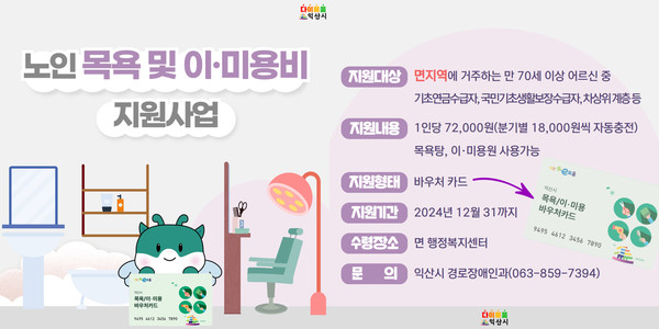 2020년 도입한 익산시 노인 목욕비 및 이·미용비지원 사업의 지원 대상은 면 지역에 주민등록을 두고 거주하는 만 70세의 국민기초생활보장수급자, 기초연금수급자, 법정 차상위 계층 등으로 현재 1만 1,885명이다.