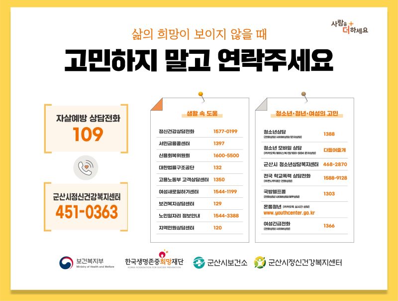 군산시 보건소 관계자는 “불안, 우울 등 어려움을 겪는 시민들이 소중한 생명을 잃지 않도록 노력하겠다”며 “정신적 어려움을 겪는 시민은 군산시 정신건강복지센터 109로 전화하면 언제든지 도움을 받을 수 있다”고 강조했다.