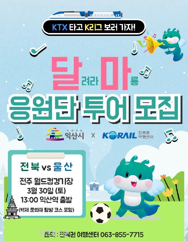 이번 관광상품은 '달마(달려라 마룡) 응원단 투어'로 KTX 열차와 시티투어버스를 타고 K-리그 경기와 익산의 백제 문화재 탐방까지 함께 즐길 수 있다. 당일코스와 1박2일 코스를 운영한다.