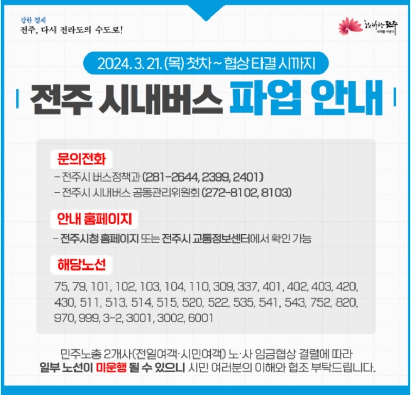 시내버스 파업과 결행에 대한 궁금한 사항은 전주시 시내버스공동관리위원회, 전주시청 버스정책과로 문의하면 된다.