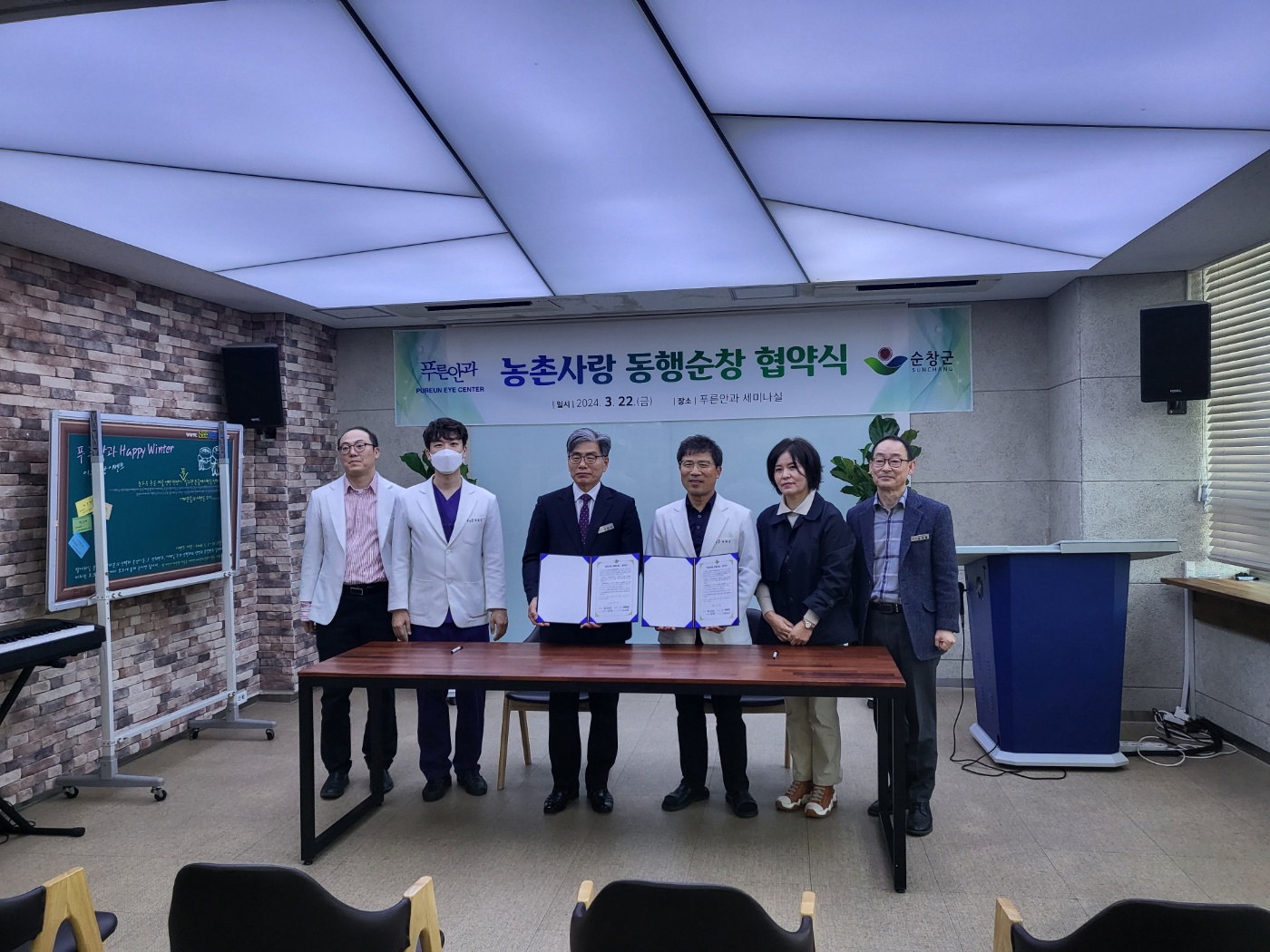 푸른 안과에서 개최된 협약식에는 김영식 순창부군수, 유태영 원장, 그리고 순창 발효 테마파크 대표 선윤숙 둥 양 기관의 주요 인사들이 참석한 가운데 진행됐다.