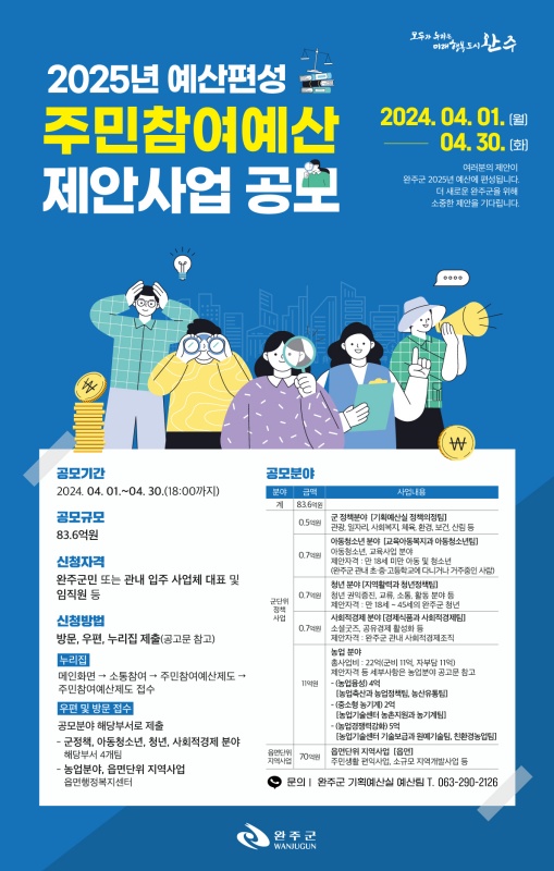 참여 방법은 완주군 홈페이지를 통해 제안할 수 있으며, 각 읍면 행정복지센터나 해당 부서에 방문 또는 우편으로도 제출할 수 있다.