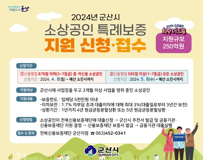 상담을 원하는 소상공인은 전북신보 군산지점(063-452-0341)에 신청하면 심사를 거쳐 보증서를 발급받을 수 있다. 이후 관내 금융기관(농협, 전북은행, 신한은행, 우리은행, 국민은행, 하나은행)에서 융자받으면 된다.