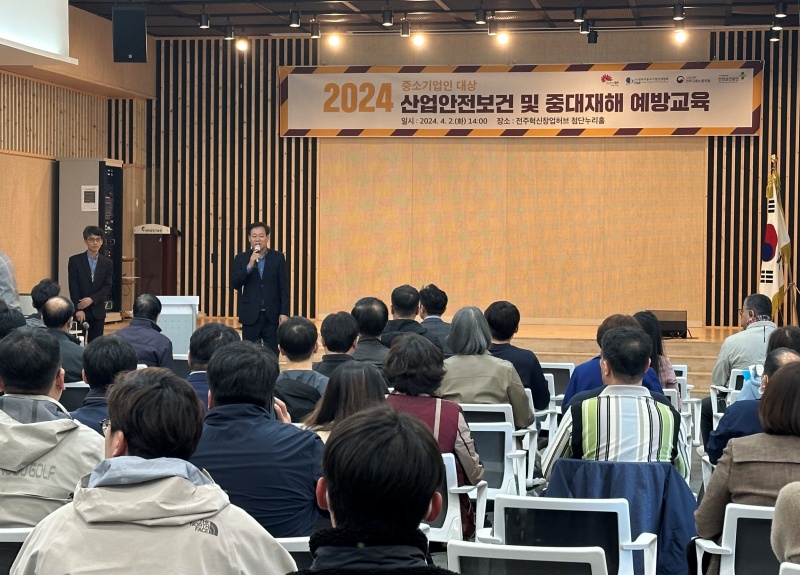 [전주=뉴전북] 전주시는 2일 전주혁신창업허브 첨단누리홀에서 전주지역 중소기업인 80명을 대상으로 중대재해 예방교육을 실시했다.