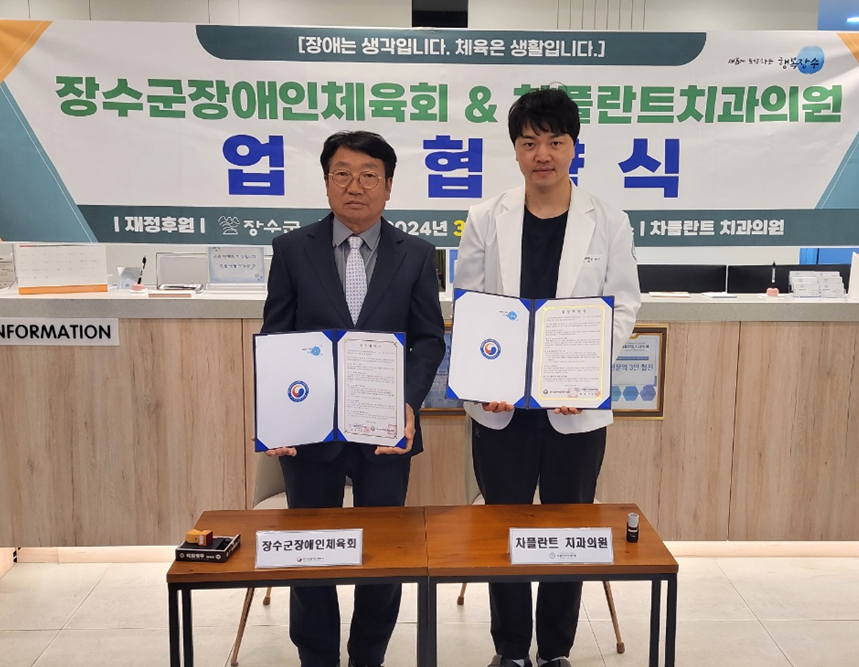 [장수=뉴전북]장수군 장애인체육회(회장 최훈식)는 지난 29일 전주 차플란트치과의원(원장 이차기)과 업무협약을 체결했다.