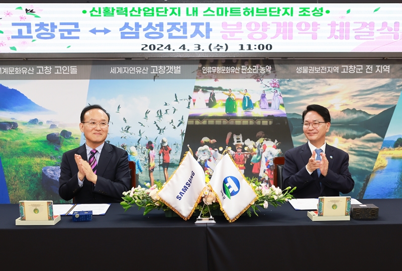 [고창=뉴전북] 고창군이 지난 3일 군청 회의실에서 삼성전자㈜와 ‘스마트허브단지(삼성전자 호남권 물류거점 가칭) 조성사업 분양계약’을 체결했다.