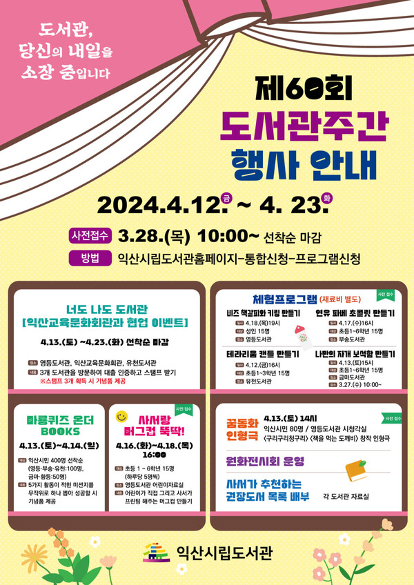 [문화=뉴전북] 익산시 영등시립도서관이 '60회 도서관주간'을 맞아 다채로운 독서문화 행사를 운영한다고 11일 밝혔다.
