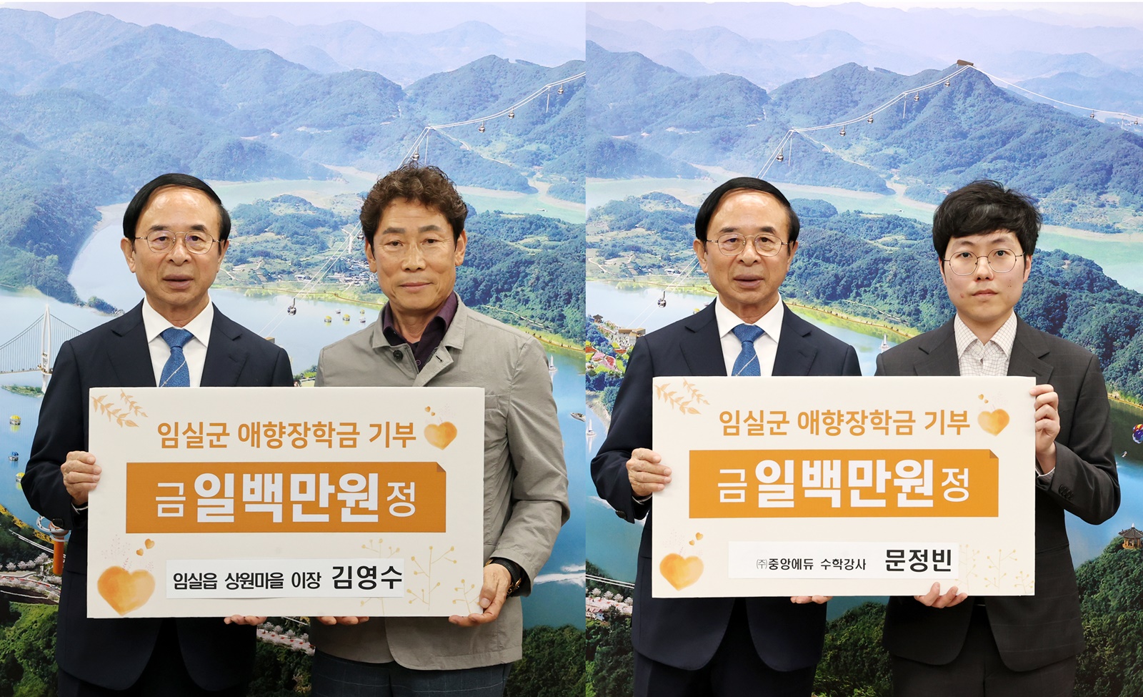 임실군애향장학회에 따르면, 임실읍 상원마을 김영수 이장과 ㈜중앙에듀 문정빈 수학강사가 임실군청을 방문하여 각각 100만 원씩 애향장학금을 기탁했다고 11일 밝혔다.