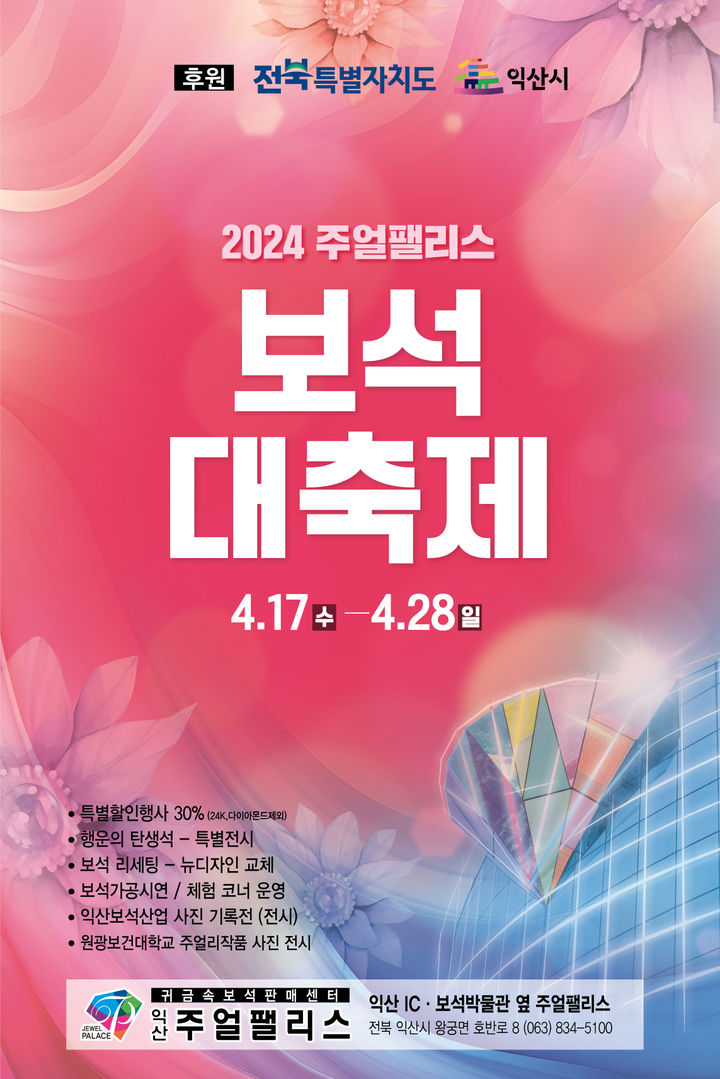 ㈔주얼팰리스협의회(회장 김대길)가 주관하고 전북특별자치도와 익산시가 후원하는 이번 행사는 오는 17일부터 28일까지 왕궁면 소재 주얼팰리스와 보석테마관광지 일원에서 진행된다.