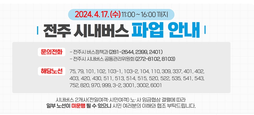 시내버스 파업과 결행에 대한 궁금한 사항은 전주시 시내버스공동관리위원회, 전주시청 버스정책과로 문의하면 된다.