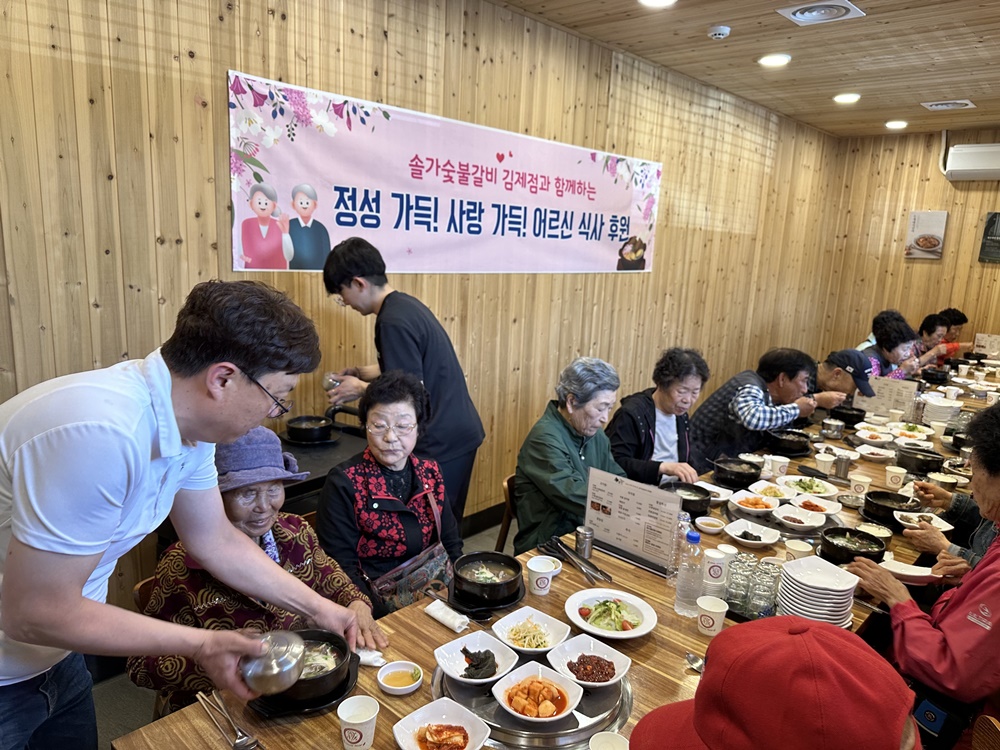 [김제=뉴전북] 김제시(시장 정성주)는 23일 솔가숯불갈비(대표 김성원)가 관내 저소득 취약계층 어르신 25명을 대상으로 정성이 가득 담긴 갈비탕을 지원했다고 밝혔다.