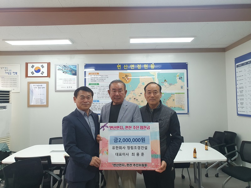 김현채 변산면지 편찬 추진위원장은 “청림조경건설 최용훈 대표이사님이 면지 편찬에 동참해주셔서 감사하다.”며 “자발적으로 관심을 가지고 참여해주시는만큼 객관적이고 사실적인 면 역사를 아우르는 변산면지 편찬을 위해 노력하겠다.”고 전했다.