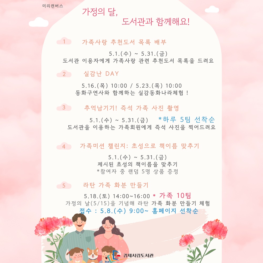 정성주 김제시장은 “지역주민의 쉼터인 도서관에서 가정의 달 5월을 맞아 가족과 함께 소중한 시간 보내도록 시민 여러분을 초대한다”고 전했다.