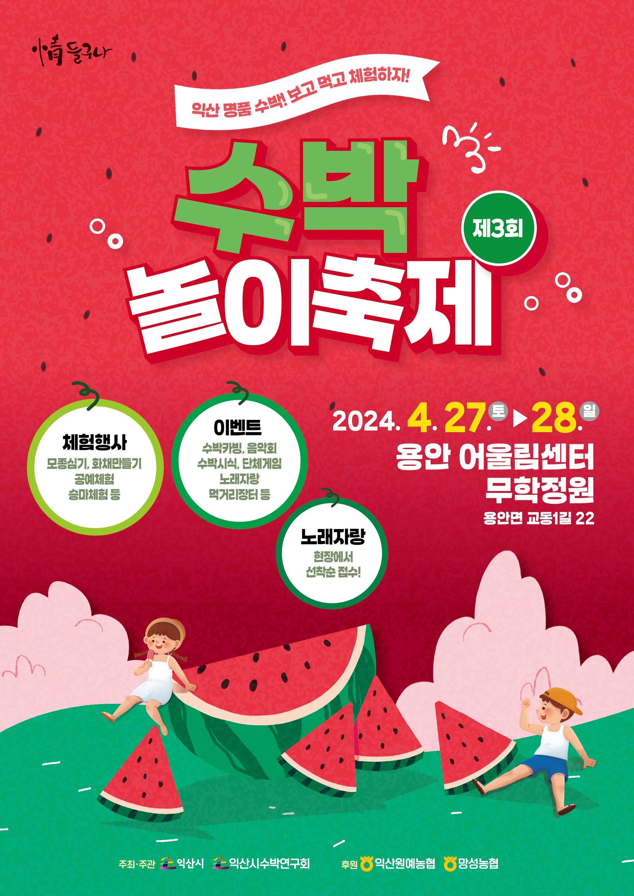 [익산=뉴전북] 익산시는 지역농산물 소비촉진을 위한 '제3회 수박놀이축제'가 용안면 용안어울림센터 일원에서 오는 27일부터 28일까지 2일간 열린다고 밝혔다.