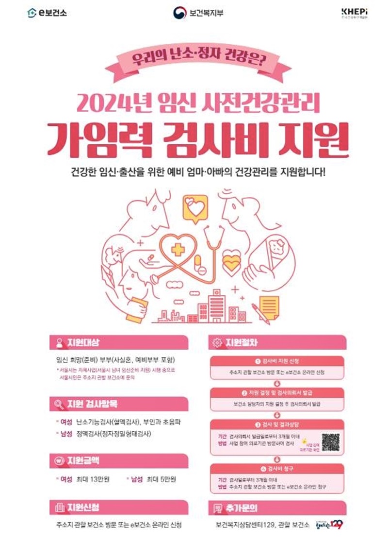 여성에게는 난소 기능검사(AMH), 초음파 검사 비용 최대 13만원을, 남성에게는 정액검사(정자 정밀 형태 검사) 비용 최대 5만원을 지원한다.