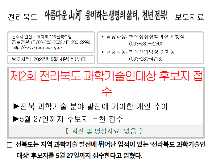 [도정=뉴전북] 전북특별자치도는 연구개발․기술혁신 등을 통해 기업의 성장지원과 지역산업 발전 등에 기여한 개인에게 수여하는 ‘과학기술인대상’ 수상 후보자를 오는 24일까지 접수한다고 밝혔다.