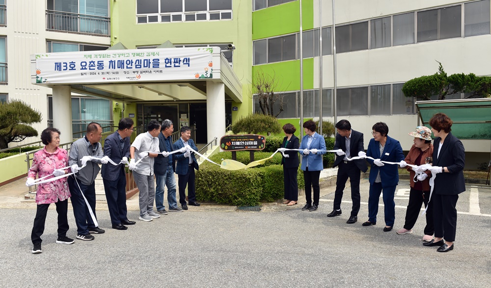 [김제=뉴전북] 김제시(시장 정성주) 치매안심센터는 1일, 부영 실버타운 아파트 입구에서 신풍 월성동, 검산주공아파트에 이어 제3호 요촌 하동 수각, 실버타운 마을을 치매안심마을로 지정했음을 알리는 현판식 행사를 개최했다고 밝혔다.