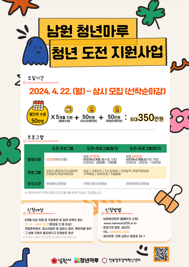 청년도전지원사업 관련 자세한 사항은 남원청년마루 홈페이지(www.namwon2030.or.kr) 또는 063-632-2030으로 문의하면 된다.