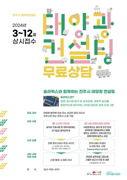 태양광 컨설팅 무료 상담은 태양광 발전에 관심이 있는 전주시민 또는 전주시 소재 기업을 대상으로 진행되며, 센터는 3차원 태양광 설계 프로그램을 활용해 맞춤형 컨설팅을 제공할 계획이다.