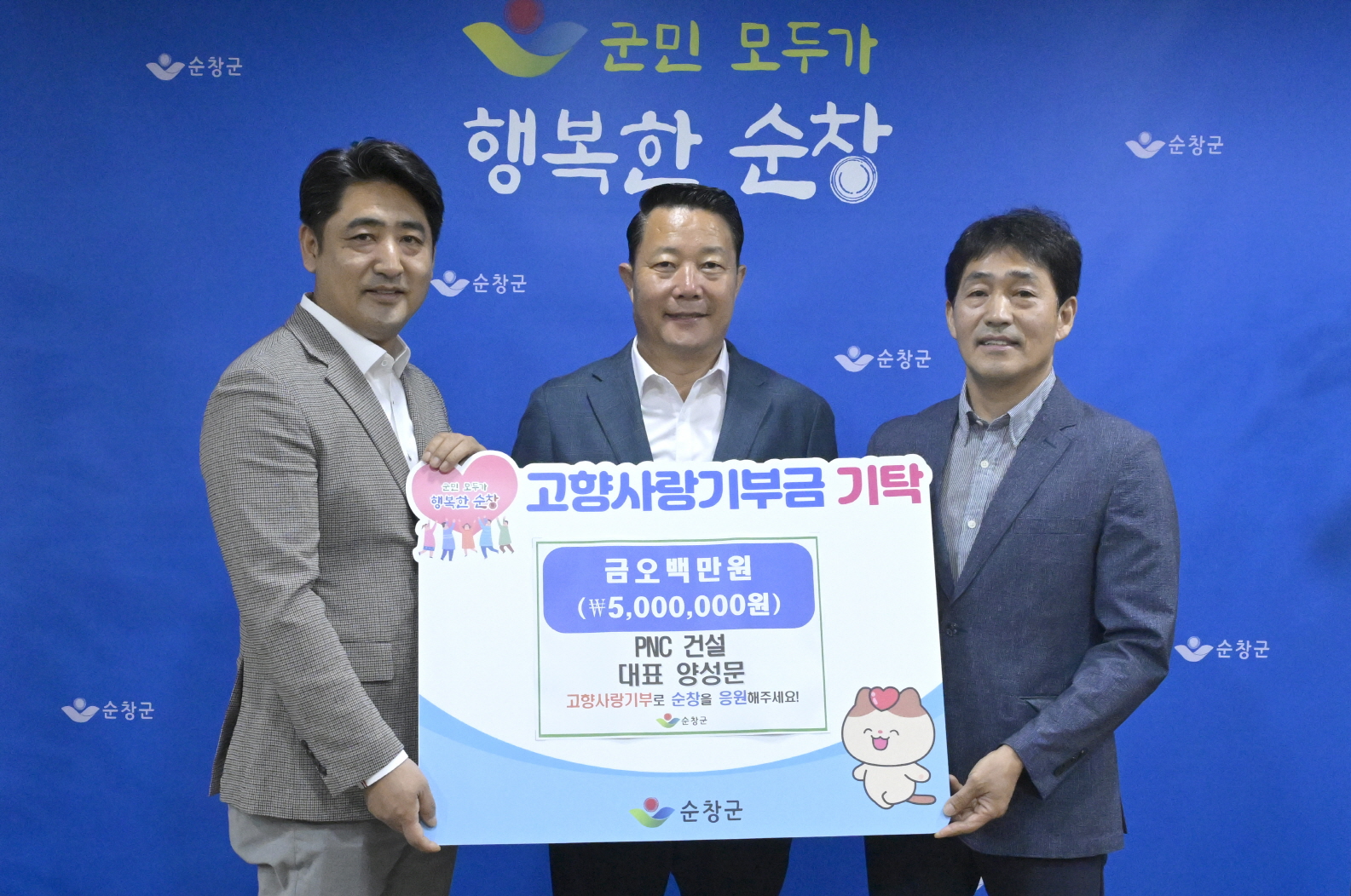 [순창=뉴전북] 전북 순창군은 2일 PNC건설 양성문 대표가 고향사랑기부금 개인 최고액인 500만 원을 기탁했다고 밝혔다.