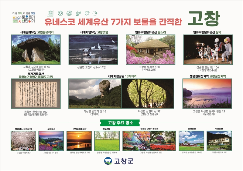 앞서 고창군은 지난해 ‘세계유산 고창방문의해’를 성공적으로 마무리하며 1천만 관광시대를 열었다. 올해는 지난해 성과를 바탕으로 ‘다시 찾고 싶은 고창’을 목표로 ‘2024 세계유산도시 고창’ 관광 홍보에 힘쓰고 있다.