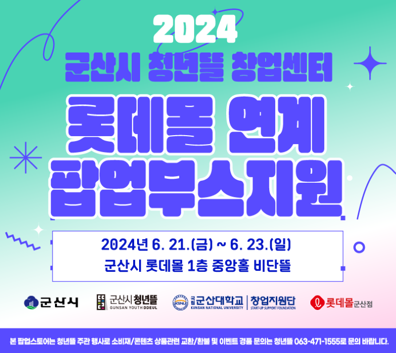 [군산=뉴전북] 군산시 청년뜰 창업센터(이하 창업센터)가 지역 창업가의 매출 증가와 판로개척을 위해 5월 13일(월)부터 5월 24일(금)까지 ‘2024년 롯데몰 연계 팝업부스 지원사업(이하 팝업부스 지원사업)’ 참여자를 모집한다.