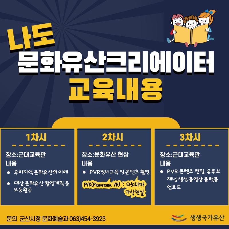교육은 3차시로 진행되며, 참가 학생들은 군산의 문화유산 이해, 촬영 계획 등 모둠활동, 360° VR 카메라를 활용한 문화유산 촬영, 문화유산 주변 환경 정화 활동(플로깅), 콘텐츠 편집, 동영상 플랫폼 업로드 등 다양한 영상콘텐츠 제작을 배우게 된다.