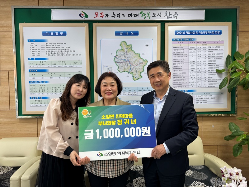 홍성삼 소양면장은 “매년 따뜻한 마음을 전달해주셔서 감사드린다”며 “기탁하신 성금은 도움을 필요로 하는 이웃을 위해 소중히 사용하겠다”고 말했다.