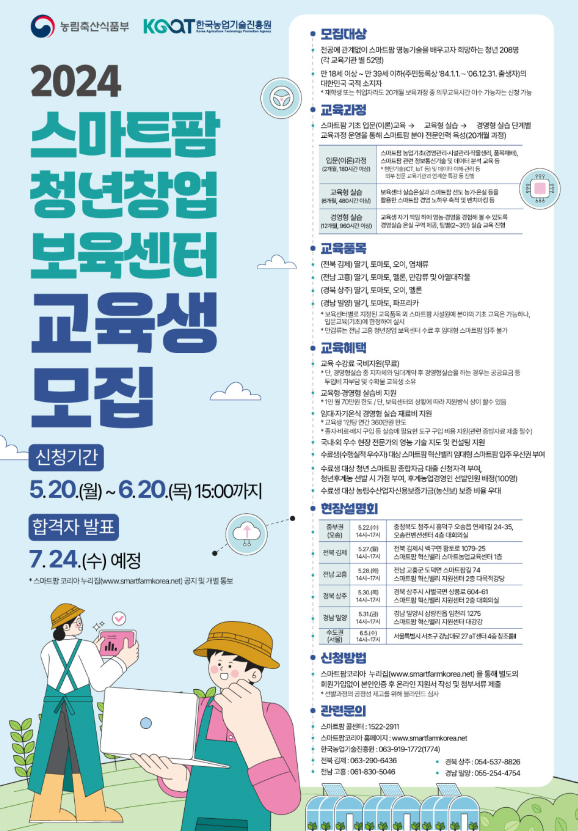 전북특별자치도농식품인력개발원(원장 이태수)은 청년창업 교육생을 6월 20일 15:00까지 모집하고, 이에 대한 현장설명회를 5월 27일 2시에 김제 스마트팜 혁신밸리 스마트농업교육센터에서 개최한다.