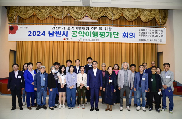 [남원=뉴전북] 남원시는 17일 시청 1층 강당에서 공약실천계획 조정 및 평가와 관련해 시민의 목소리를 반영하고, 민주적인 의사소통 과정으로 시민과 함께하는 공약 실천을 위해 공약이행평가단 35명을 위촉하고 1차 회의를 개최했다.