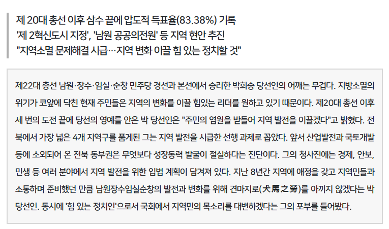 최경식 남원시장은 국회의원 당선을 진심으로 축하드리며 각종 현안과 국비 확보, 주민숙원사업 해결을 위해 적극적인 지원과 협조를 바란다오늘 간담회를 시작으로 국회의원 당선인과 4개 시·군이 지속적으로 긴밀히 소통하자고 말했다.