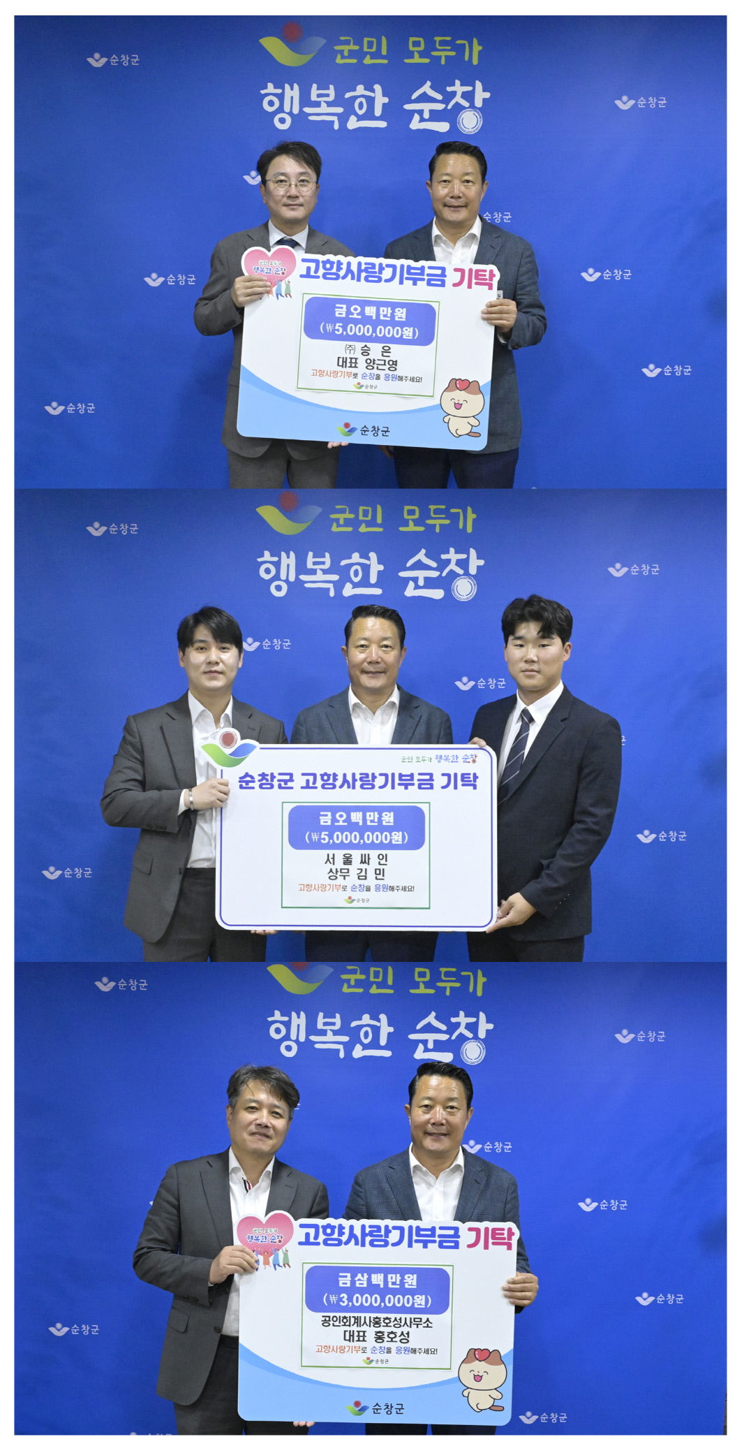 [순창=뉴전북] 전북 순창군은 17일 ㈜승은 양근영 대표와 서울싸인의 김민 상무가 고향사랑기부금 개인 최고액인 각 500만 원, 홍호성 회계사가 300만 원을 기탁했다고 밝혔다.